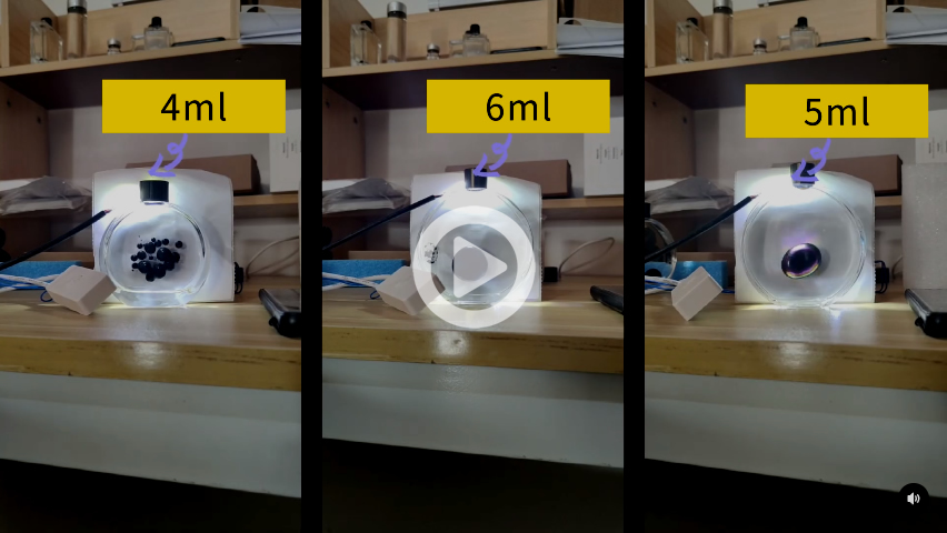 With a consistent magnetic force and container, with 4 ml, 5 ml and 6 ml of ferrofluid, we can see that they behave quite differently. Which one do you prefer?